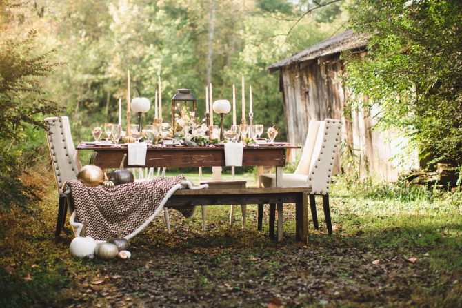 I don’t know about you, but now that Halloween is officially behind us, I’m already setting my sights on Thanksgiving. For many, a well-designed table is about as important as the turkey so a team of creatives in Knoxville, Tenn., created this shoot that is not only perfect for wedding and holiday table inspiration, it’s extremely budget-friendly. “Our goal was to show how to achieve an elegant Thanksgiving tablescape for fall using easy and affordable DIY elements. We wanted to make the gorgeous tablescapes seen on the front of Pottery Barn and Country Living attainable for the everyday person,” says Kathleen, the photographer behind Jo Photo. “Minus the china, flatware, and the lovely floral centerpiece, everything seen on the tablescape was purchased at The Dollar Store or a craft store.”