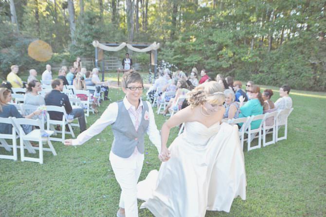 After receiving Amanda and Jennifer’s playful picnic engagement shoot from Six Hearts Photography, we knew their wedding would be bursting with personality. Setting up a carnival-themed celebration in their own backyard, guests enjoyed popcorn, lemonade and candy stands that were homemade by the brides and Jennifer’s dad. The talented soonlyweds also DIYed their own backyard Scrabble, checker boards, cornhole, Chinese lanterns, ring toss and more — there was certainly no shortage of entertainment. “We are a very playful couple so we wanted a relaxed environment for our guests,” says Amanda.