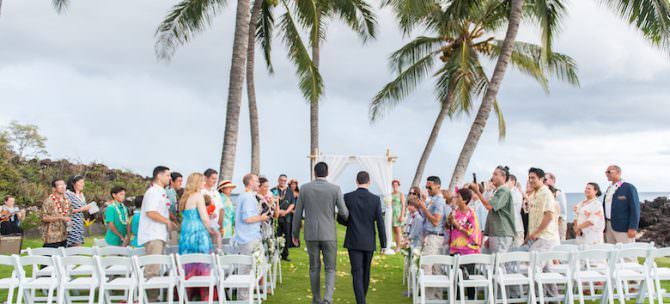 Ben, a Hollywood executive producer, met the love of his life, Pono, at a banquet for a national volleyball tournament. After dating for some time, Ben proposed in September by surprising Pono at a family gathering in Hawaii when he was “supposed” to be working in New York. When it came to deciding where to wed, the choice was simple. They headed to Pono’s hometown of Maui and hosted an absolutely gorgeous ceremony with both Hawaiian and Jewish traditions at Makena Beach and Golf Resort, planned by White Orchid Wedding and captured by Mariah Milan Photography.