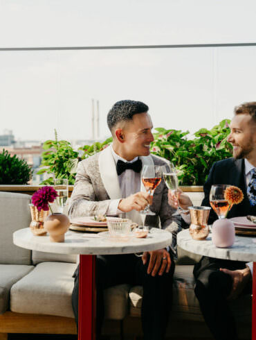 Atop the Kimpton Journeyman Hotel where sun sweeps across the rooftop high above the streets of Milwaukee, two dashing grooms had a...