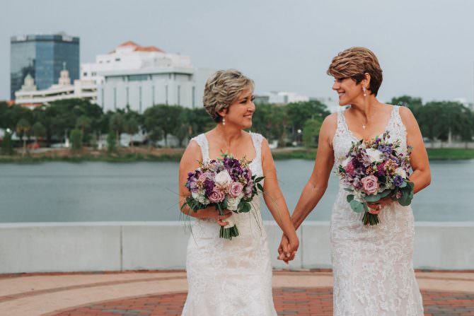 They parted ways only to slip into their stunning lace-covered wedding dresses and reunited for an emotional first look before taking a walk down the aisle that was 20 years in the making. Captured by Grind & Press Photography, Bobbie and Tracy’s Florida wedding at the historic Mirror Lake Lyceum in St. Petersburg was filled with pink and purple hues and tender moments, resulting in an absolutely gorgeous wedding for a gorgeous couple!