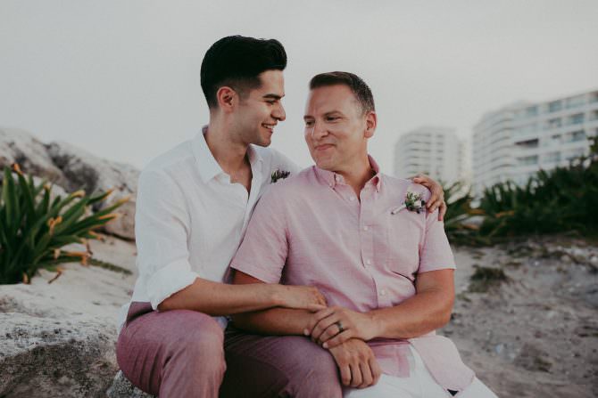 Sunny Cancún, Mexico, was calling Brian and Joey’s names for their wedding day, and they brought their closest friends and family along for the destination celebration! They started the day by getting ready together and then walked down to the beach where a beautiful arbor with crisp white linens, lush pink roses and a chandelier was waiting for them. A harp played as they walked down the aisle, escorted by their mothers, and guests had tears in their eyes as they exchanged vows in an emotional ceremony.