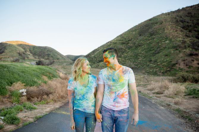 “Now I know what yellow tastes like,” Kyle exclaimed as Britney pelted him with a fistful of colored powder. These color war engagement photos candidly capture this couple “fighting” but with smiles from ear to ear. Inspired by their participation in a previous 5K color run and a spot-on suggestion from Jennifer Corbin Photography, this couple couldn’t wait to get down and dirty. Although the picturesque California mountains in the background are quite breathtaking, they pale in comparison to the vibrant, overjoyed soonlyweds, who look like walking paintings themselves.