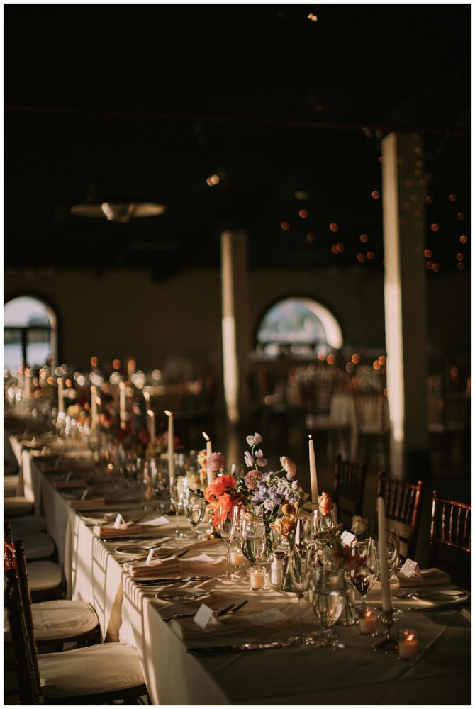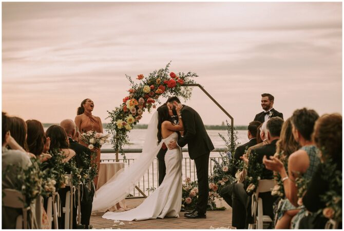 Their ceremony took place on the brick promenade, framed by a geometric altar adorned with lush, colorful florals. “The ceremony was our favorite part of the wedding. Even with over 200 people with us, it felt very intimate in front of the vast harbor,” Victoria said.