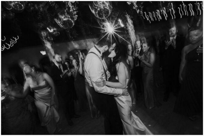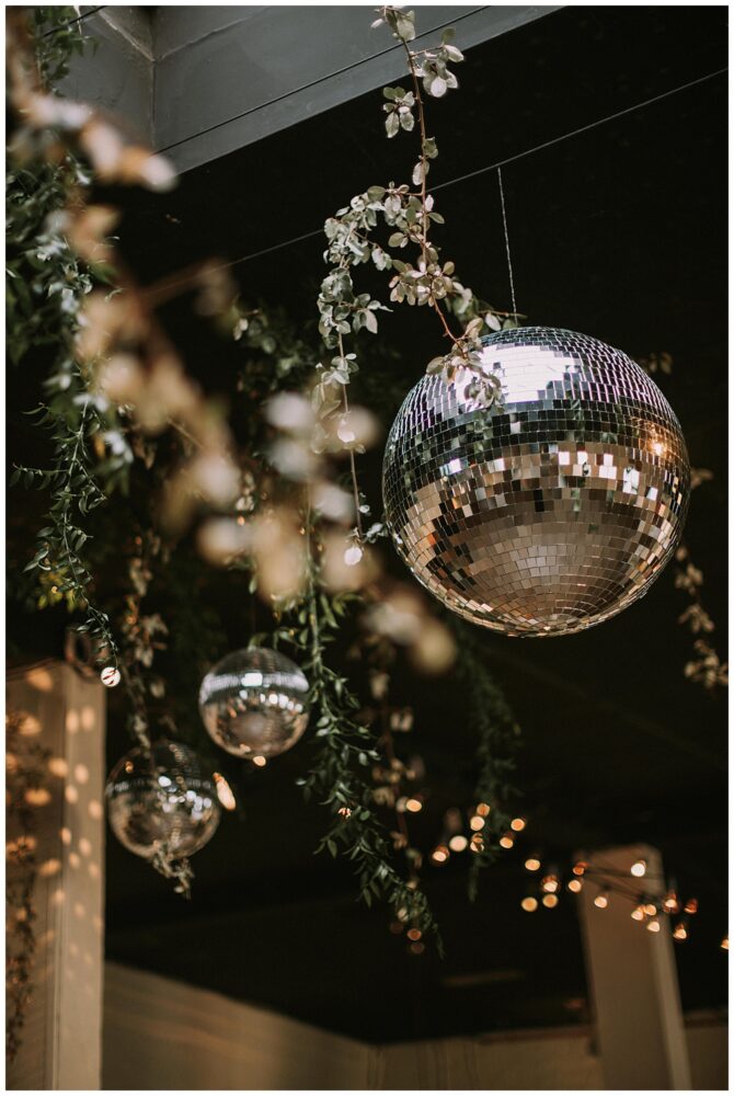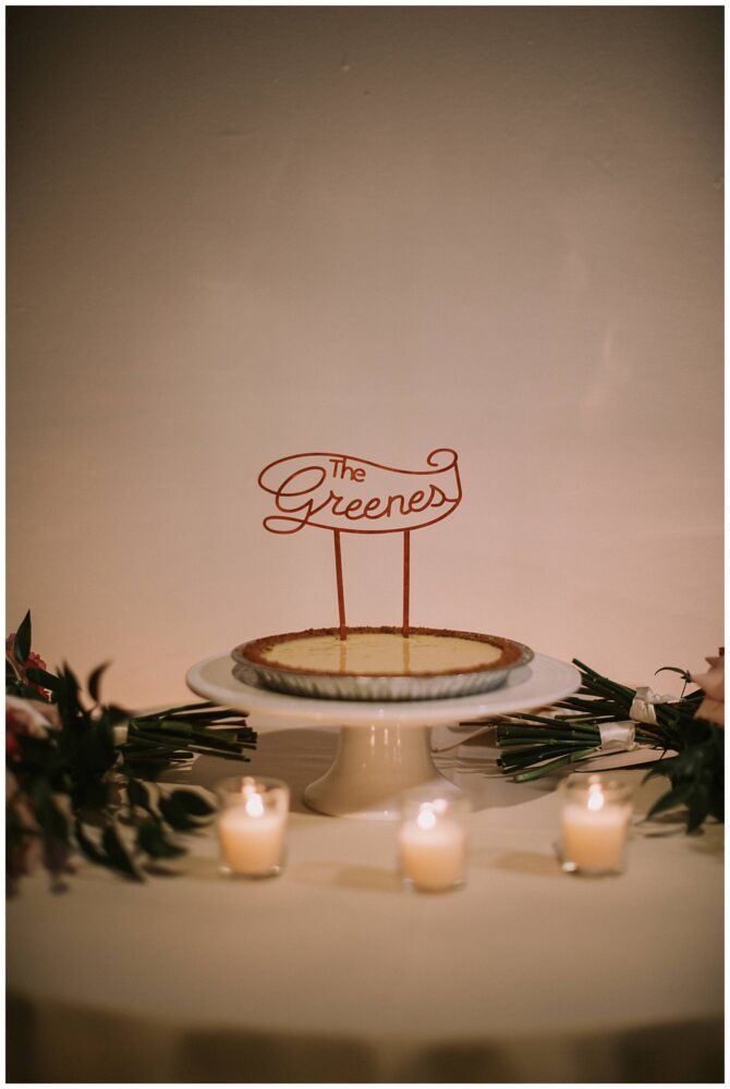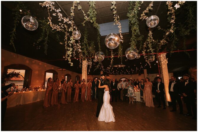 As the sun set, guests moved indoors to dine at candlelit tables overlooking the harbor. The ceiling dripped with greenery and shimmering disco balls, creating an atmosphere of warmth and celebration. The couple added personal touches throughout, including a custom wedding logo, which appeared on everything from coasters to a neon sign. Keeping with their Brooklyn theme, they skipped the traditional wedding cake in favor of pies.