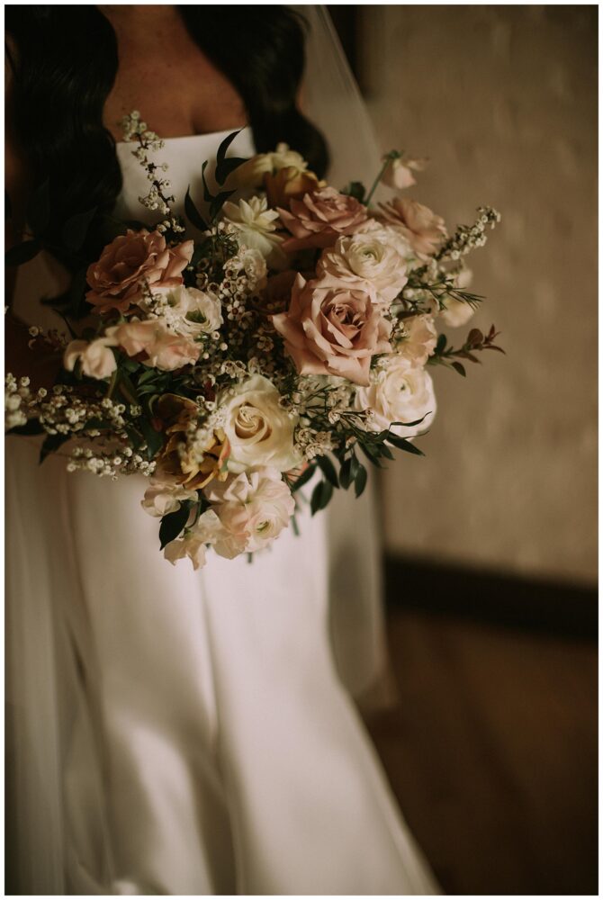 Their color palette was a blend of rich, earthy botanicals — rusty oranges, lilacs, and gray blues — softened with creamy ivory and yellow tones. The floral arrangements featured dusty roses, butter-yellow peonies, chrysanthemums, and billy balls for the ceremony, transitioning to magenta peonies, blue delphiniums, and purple allium for the reception.