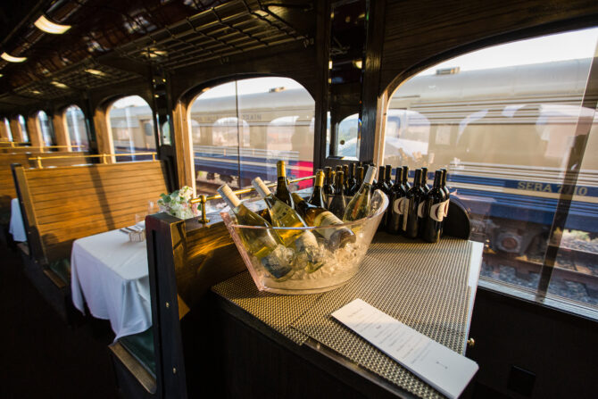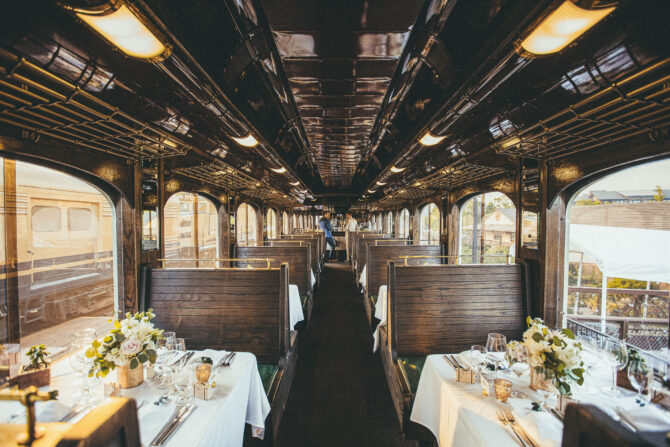 “The major issue comes down to size, as many trains have tables and seats that are bolted to the floor. This means the design and seating chart that you would see at a traditional wedding would need to be dramatically shifted to accommodate the current setup. One workaround would be considering trains that have stations with meeting and lounge spaces that can be augmented with typical wedding seating and decor,” says Keith Willard, owner of Keith Willard Events.