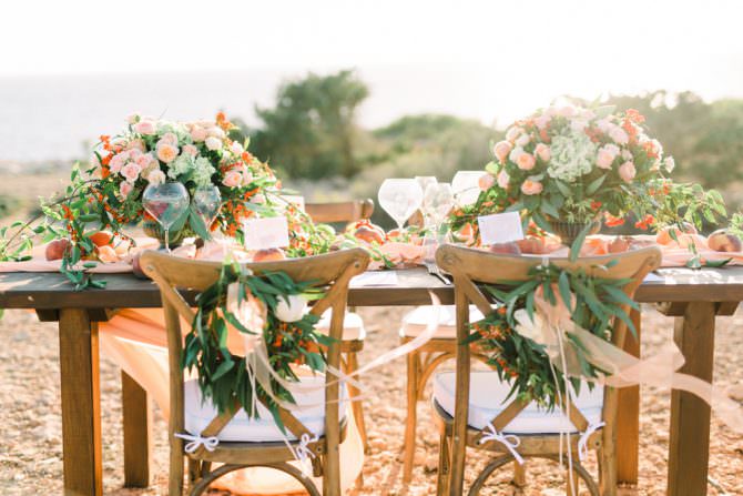 On the cliffs of Ibiza, overlooking the Mediterranean sea, two doors stand at the aptly named, Las Puertas del Cielo, which means the doors of heaven. The land at the edge of the coast serves as the scenic setting for today’s mystical styled shoot. A dreamy blush and peach color palette infuses a romantic touch of color into the design, which pops against the lush green olive leaves, and we’re swooning over the watercolor stationery and the way peaches are sprinkled throughout the whimsical tablescape. Captured by Heike Moellers Photography, everything about this wedding inspiration, from the deep-neckline wedding dress to the peach macarons, is simply heavenly!