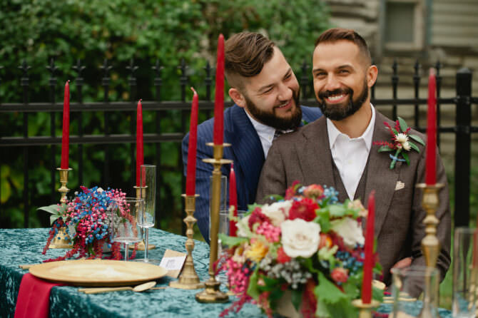 A blend of concrete, wood and mixed metals star in today’s styled shoot, which was inspired by the very city in which it takes place — Detroit. In the heart of Motor City, local creatives brought this colorful and eclectic wedding inspiration shoot together at The Villages Bier & Weingarten, a beloved spot where friends gather over beer and wine on sunny weekends. The venue gives off charming backyard vibes, which is a perfect fit for an intimate affair celebrating two dashing grooms. To contrast against some of the industrial elements, bright beautiful florals were brought in, and for a unique ceremony backdrop, baby’s breath was painted pink and blue and fastened to a circular arch.