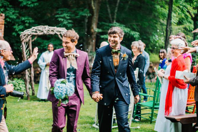 Not afraid of a little color, they let their personalities shine in their wedding day wardrobe choices. Eric donned a navy suit, plaid shirt and maroon suspenders adorned with foxes. Danny looked equally dapper in a maroon suit, chambray shirt accessorized with an oversized floral bow tie, a golden crown and two small pins — one of an owl, the other of an arrow, gifted to him by his soon-to-be husband.