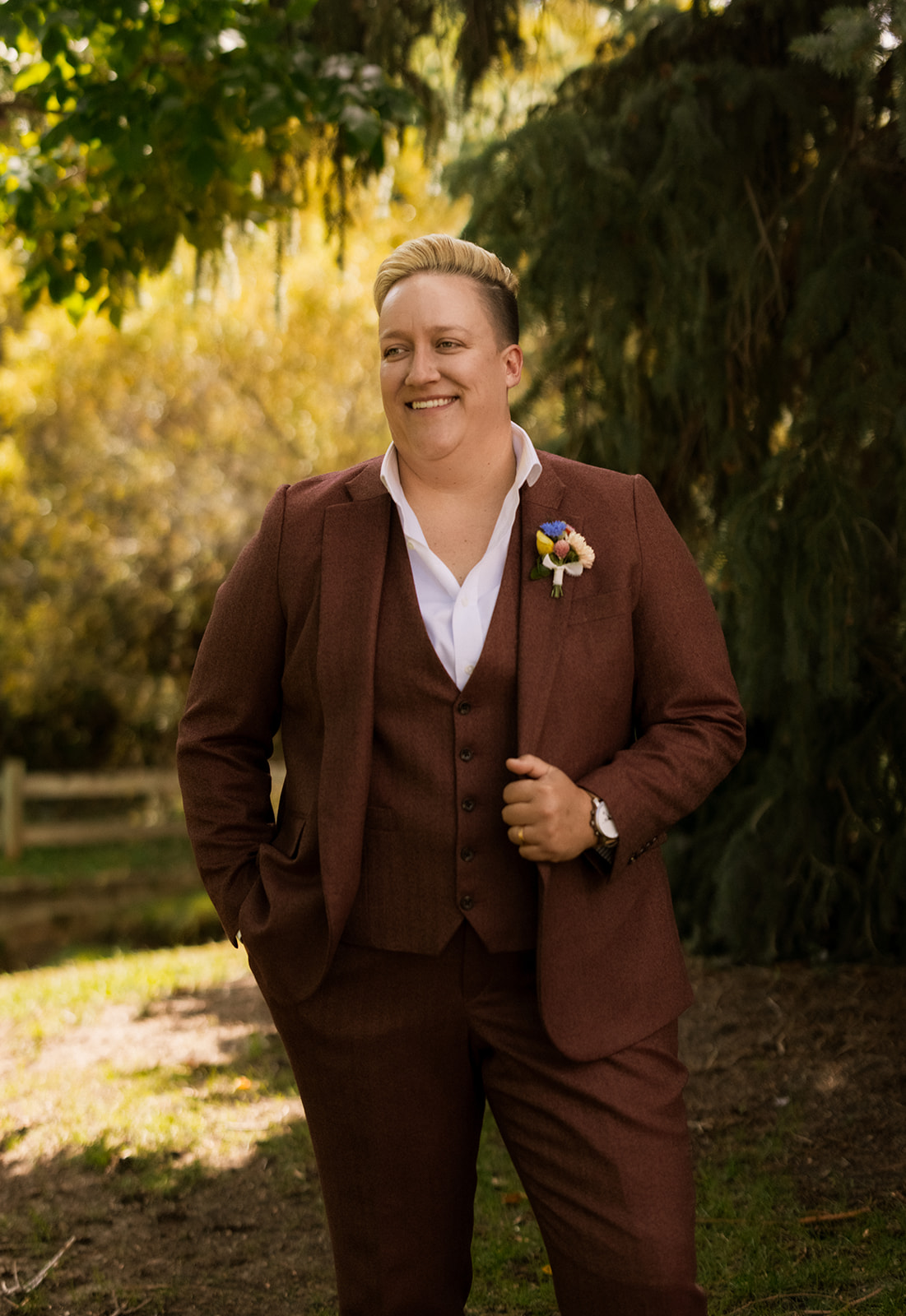 James rocked a stunning mauve suit, complete with a full lapel boutonniere, a floral statement piece in itself. The other groom wore a navy-toned tuxedo jacket embroidered with intricate floral details, blending masculinity with whimsical, garden-inspired elegance. Together, their outfits showcased not only their individual style but also their shared confidence.