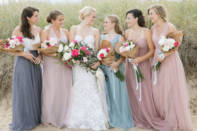 When it comes to designing a wedding, it’s easy to get caught up in the trendy ideas that saturate social media, but we’re firm believers that the best weddings have details that are unique to the relationship they’re celebrating. And today’s gorgeous wedding is perfect proof of that. One of our favorite details from Hannah and Patrick’s ballet-inspired wedding was the vibrant, lush florals and the unique way the bride chose to style the bridesmaids bouquets in particular.