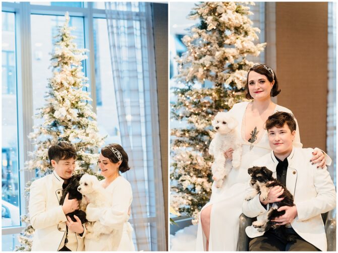 Their love story continued to unfold through family trips, quiet wedding planning, and building a home together — including adopting their beloved dogs, Carter and Conrad. Then, on New Year’s Day, after brunch at one of their favorite spots, Narragansett Brewery, Jane proposed as they walked Carter through India Point Park. It was simple, heartfelt, and perfectly them.