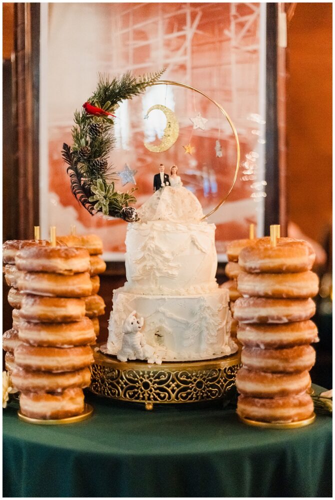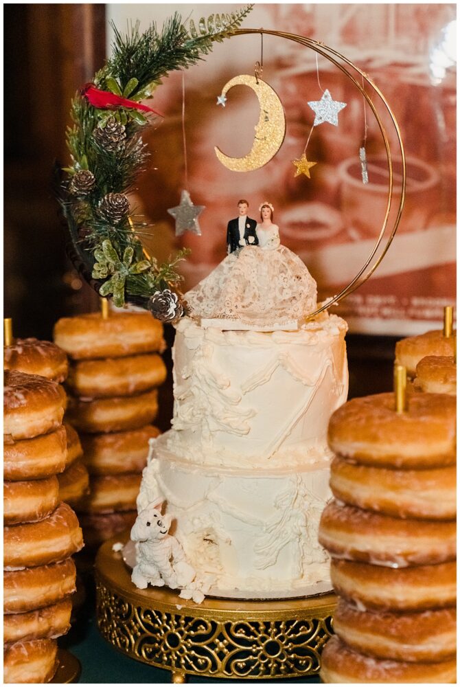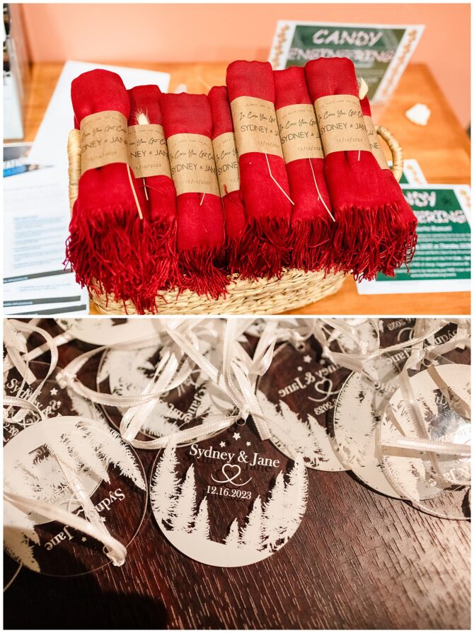 Personal touches made the day deeply meaningful: Sydney’s mom baked the cake and upcycled her grandparents’ original cake topper, a friend arranged Sydney’s bouquet inside a 1920s nosegay holder, guests received red scarves to stay warm, and custom ornaments sent everyone home with a piece of the celebration.