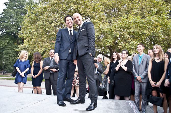 The Venue: “We love the life we’ve built together here and it felt right,” says Alberto of their choice to stay stateside. They held the ceremony in Fort Greene Park in Brooklyn on a beautiful fall day. “The park is beautiful and iconic,” he continues. “It exists in large part due to the efforts of Walt Whitman, which seemed appropriate for a wedding of two gay men.”