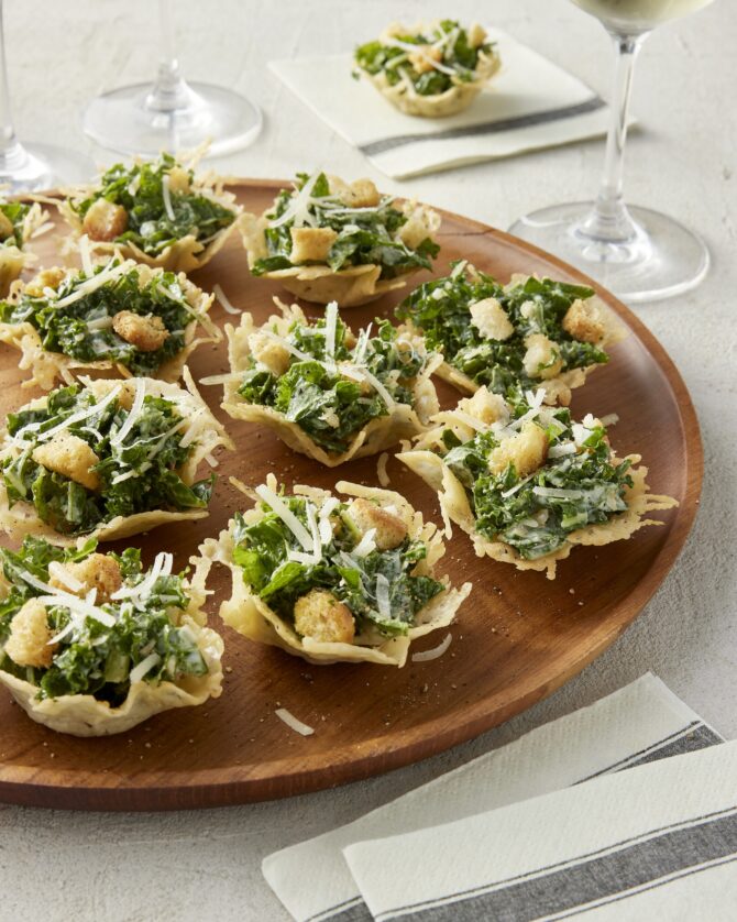 Take your salad to-go with these poppable salad apps. “The crispy Parmesan cups elevate the experience, complementing the fresh crunch of the kale,” adds Brown.