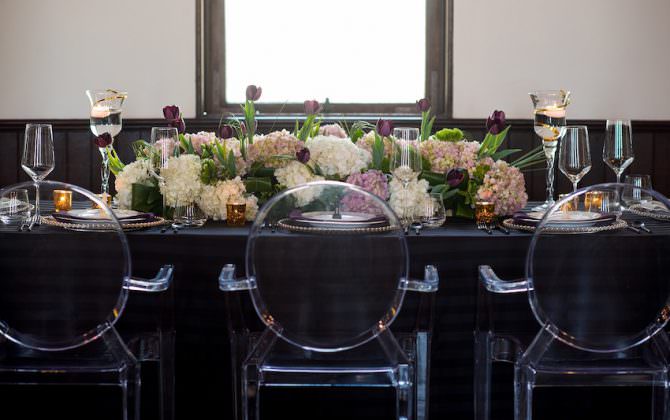 A creative team of wedding pros from Raleigh, N.C., put together a gorgeous styled shoot, featuring a regal palette of purple, black and gold, and pin-worthy inspiration such as chess piece table numbers, gold calligraphy details and 3-D floral cake.