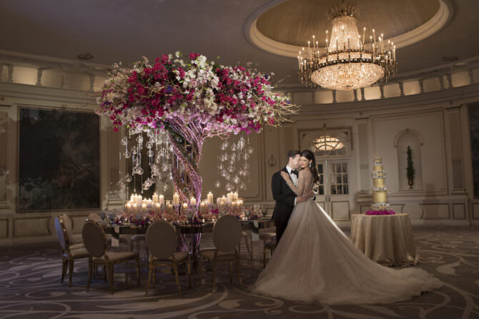 We’ve made it! It’s officially Royal Wedding week, and we are only days away from the royal reveal. But before we get to see Meghan Markle walk down the aisle to marry her Prince, today we’re indulging in this inspiration shoot where a team of creatives imagined what a royal wedding in New York City would look like. Appropriately set at the elegant Lotte New York Palace, a royally luxe color palette of purple and gold was selected to complement the incredible, lavish floral design by Tantawan Bloom. LLG Events spearheaded the beautiful design and Ron Ben-Israel Cakes created a decadent, towering cake with gold and white layers.