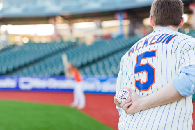 I love it when couples pick an engagement shoot location that means something to them, and for huge fans of a sports team, what could be better than their beloved stadium? In celebration of this week’s World Series matchup against the Kansas City Royals and the New York Mets (go Mets!), we wanted to spotlight fans of these two baseball teams, capturing their love at Kauffman Stadium and Citi Field (or even squeezing some fandom into their regular shoot!). These e-sessions are filled with diamonds (both of the bling and baseball variety) and a love of the game and each other.