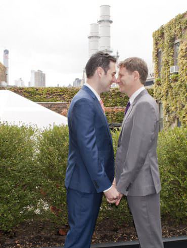 Self-proclaimed foodies Greg and Michael knew that the reception cuisine would play a significant role in their wedding day. With a priority of finding a venue that they could bring their own caterer, they came across 632 on Hudson, an antique-laden townhouse-turned-party space. The hidden gem spurred their carnival theme vision, executed amazingly by Bernadette Smith of 14 Stories with fortune tellers giving guests a peek into the future and burlesque entertainers serving absinthe cotton candy.