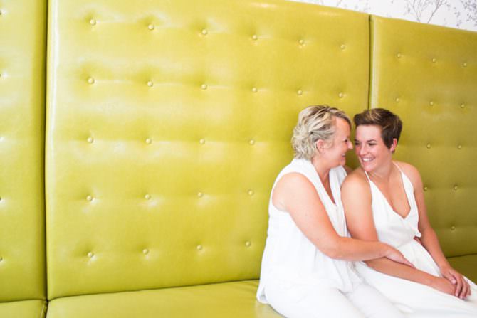The urban vibe in Sarah and Stephanie’s wedding at Kentucky’s New Riff distillery feels positively fresh against the old bourbon-making tradition. The venue, which opened last year, is a true working distillery and boasts sleek, modern spaces for events. The brides exchanged vows on the patio overlooking sweeping views of Newport, Ky., and followed with a laid-back dinner for their guests. “No formalness,” says Fyrefly Photography, the talent behind the lens. “Just happy toasts, lots of dancing and a cake topper to mirror this couple’s love for each other and a growing business of yummy Streetpops!”