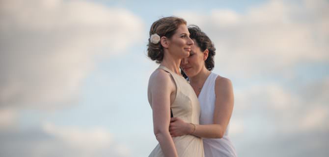 “We had a ceremony that honored our Jewish heritage but was personalized to us. A Rabbi friend of ours came from Los Angeles to conduct the ceremony and she guided us through all of the traditional Jewish wedding customs, some of which we kept — breaking the glass, of course — but many of which we omitted or translated into something that felt more personal for us,” says the brides. “For instance, it’s traditional to recite the seven blessings at a wedding; we instead chose a favorite Wallace Stevens poem that we felt embodied the same sentiments. Another amazing thing about our wedding ceremony was that it happened to fall on the same weekend that the Supreme Court ruling on same sex marriage was issued, so we had even more to celebrate.”