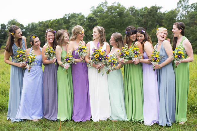 - Pick a color, any color. Whatever you decide, there are shades of that color each of your bridesmaids can wear, which go from light to dark. “The secret to mastering this mix-and-match is to keep them all in the same style dress,” advises Susan Di Meo, President of Synderela, a fashion company in New York City that specializes in creating custom bridesmaid gowns.