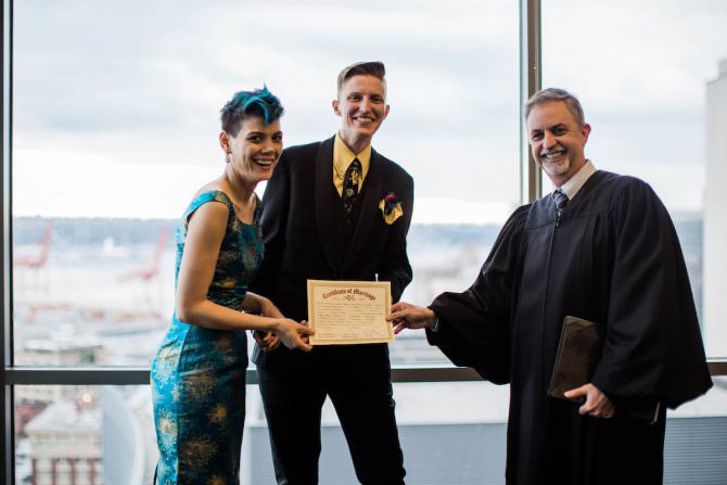 High above the busy streets of Seattle in front of the courthouse’s floor-to-ceiling windows, Shawna and Lacey were surrounded by the love of their two close friends and Shawna’s kids as they tied the knot in an intimate ceremony. “I love that we chose to elope!” Lacey says. “It was very simple, and there was no stress. And at the end of it all, I ended up marrying my best friend, my queen, and partner in life.”