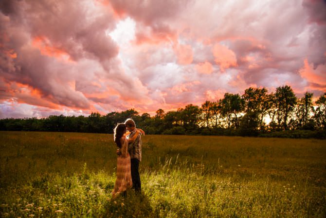 Shay and Giuliano wanted to capture their love at Shay’s parents house, where their wedding would take place later in the year and where their horses were kept (which they included in the shoot, natch). Turns out, an older couple who were both artists lived a couple of miles down the road and boasted quite the art installation — the bowling all field. That, paired with one of the most vivid sunset I’ve ever seen, makes for an engagement session that is a kaleidoscopic gem of inspiration.