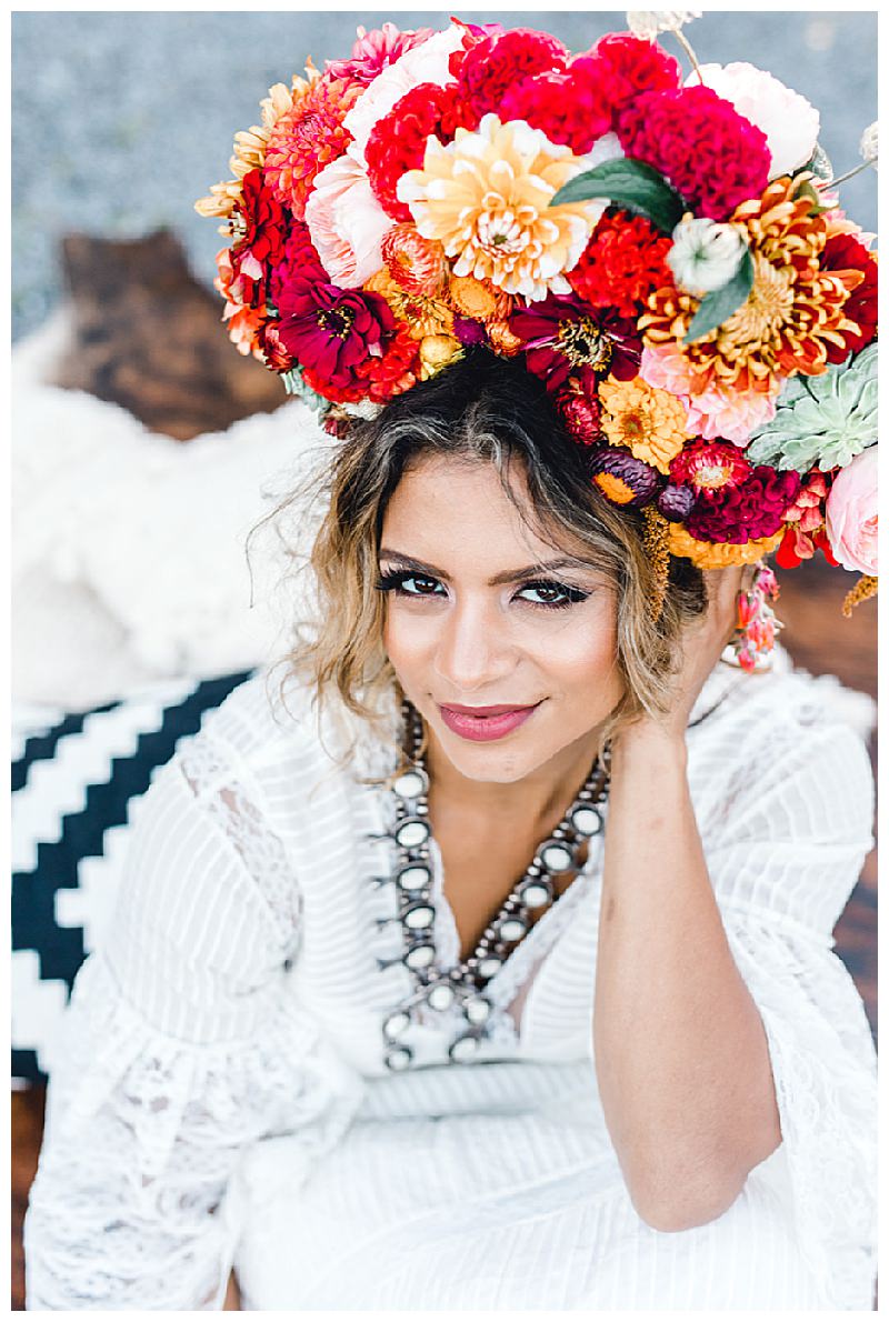 Wanting to bring the magic of the Southwest to Maine, a group of creatives brought together elements of bohemian, rustic and modern to create an inspiration that is total eye candy in gorgeous earth tones. Pampas grass flanks the ceremony arbor and hangs from above, while a lounge is anchored by a cowhide rug and the tablescape is textured with natural fiber placemats, fringed paperie and leather details. The boho BHLDN gown is topped with a Beyonce-inspired headpiece, stuffed with colorful blooms that pop against the neutral palette.