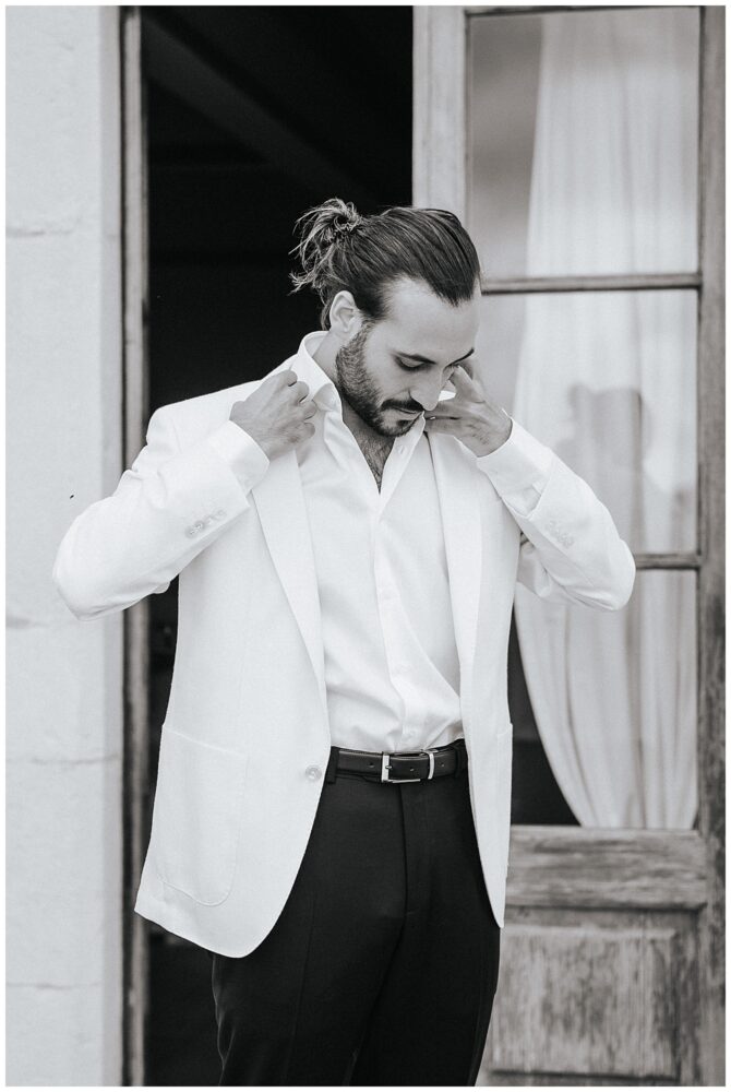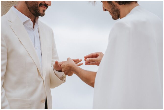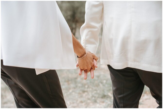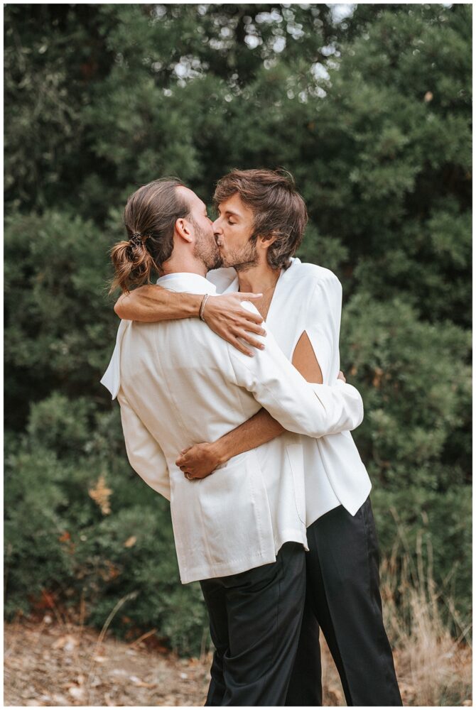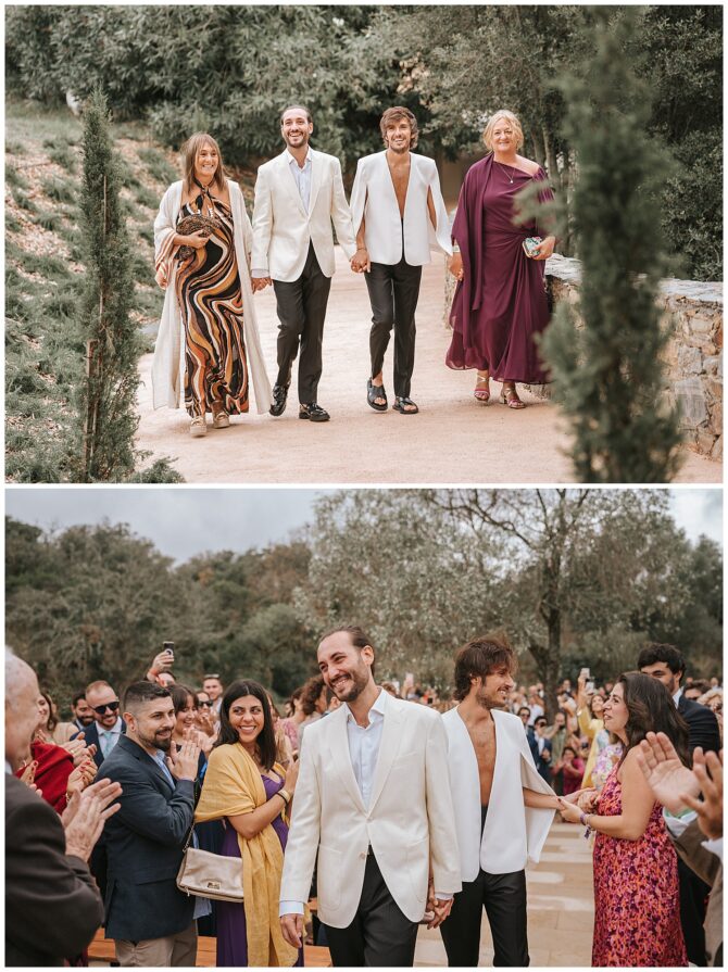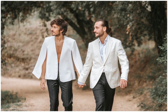 The grooms, however, wore white on top and black on the bottom; a symbolic reflection of their two lives coming together. Albert chose an elegant white jacket, while Victor made a powerful statement by transforming his mother’s vintage jacket into an open cape, worn with a bare chest. “It was a declaration of liberation from the shame he had carried about his body,” shared the couple.