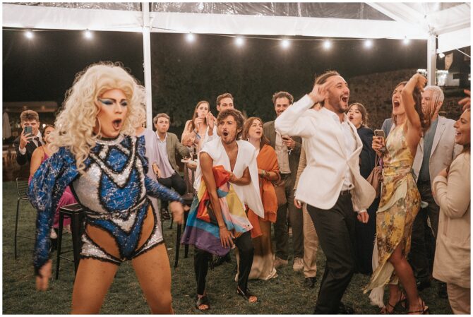 The drag show was one of the most memorable moments. The pair recalls, “It was queer joy at its loudest and most unapologetic. In that moment, our wedding wasn’t just a celebration of us, it was a celebration of everyone who’s ever felt different, and finally felt safe to shine.”