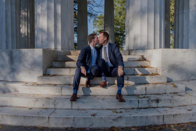 “We had two criteria for our wedding ceremony,” Ian says. “We wanted it to be in D.C., and we wanted it to be outside. As soon as we saw the D.C. War Memorial, the idea of being married in a national park took hold, and we knew we had to have it there!” Inside the marble memorial, Terry and Ian’s guests sat in a circle and surrounded them during the ceremony. In addition to a hand fasting ritual, where the grooms’s hands were bound together in colorful ropes as they exchanged vows, they also had a unique ring warming ceremony.
