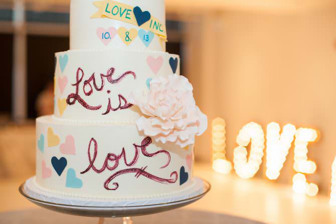 You can’t have a wedding industry party without a wedding cake. I was so excited when Amy of Sugar Flower Cake Shop offered her services because I’ve long been a fan of her amazing talent. I mean, look at this cake. I love everything about it: the hand-painted hearts, the calligraphed “Love Is Love” and her signature sugar flower. Perfection.