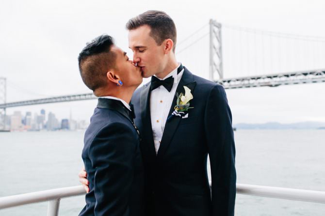 For their wedding inspiration, Tom and Mark retraced their steps from the night they got engaged, opting to exchange vows while sailing around San Francisco Bay. “We wanted something different, not a lot of people can say they got married on a yacht on San Francisco Bay,” explains Mark of their venue choice. “It took Tom and I another four years after our proposal to get married because we wanted to get married in our home state of California,” Mark continues. “And we finally did it after the overturn of Prop 8.”