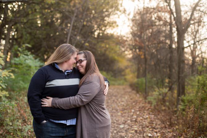 There is something so captivating about discovering why people resonate with what they do, and it always varies from couple to couple. At Ewing II Park in Bloomington, Ill., Val and Jean enjoy a relaxed engagement shoot, surrounded by wooded nature and beautiful memories of dog walks and romance. The couple also incorporated some photos at Uptown Normal, one of their favorite stomping grounds for shopping and entertainment. “It was simply the most perfect location to show off who we are as a couple,” Val explains. With the assistance of Sarah Brianne Photography, Val and Jean open their hearts to us, exuding their incredible, loving warmth and the palpable connection of their souls.