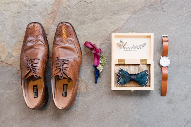As a modern twist on a classic accessory, Brackish bow ties are vibrant in color with eclectic, eye-catching designs and a striking texture that makes each tie truly unique. Each bow tie is crafted from carefully selected turkey feathers that are intricately hand placed by a team of 50 talented artisans in Charleston, South Carolina. After about four to five hours of work, the wearable work of art is delicately placed inside its own box branded with a B for safekeeping. But bow ties aren’t where the fun stops. In addition to feather cummerbunds, loafers and lapel pins, last year, Brackish introduced feather pocket squares that complement some of their most popular bow tie designs. So now you can accessorize your wedding look with standout accessories from head to toe that will have your guests talking all night long.