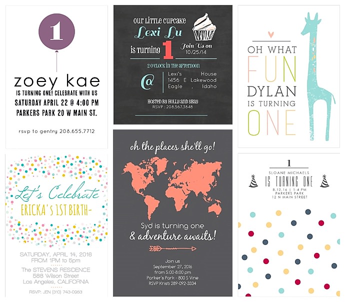 Top left, clockwise: Simple Balloon Birthday Invitation, Our Little Cupcake Birthday Invitation, Fun Giraffe First Birthday Invitation, Polka Dot First Birthday Invitation, The Places You'll Go Invitation, Confetti First Birthday Invitation